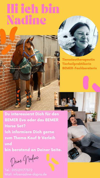 Gerne berate ich dich auch telefonisch über das Bemer Horse-Set, welche Möglichkeiten es gibt das Set zusammenzustellen und über die Finanzierung. Unter folgenden Link kommst du auf den Bemershop.Auch hier begleite ich dich bei Bedarf gerne telefonisch, damit du dich gut zurecht findest.
